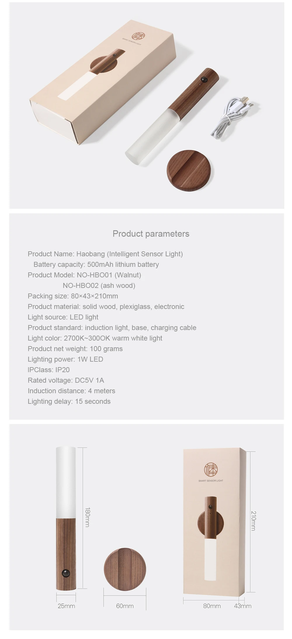 Product size: 25×25×180MM (night light) 60×60MM (base)